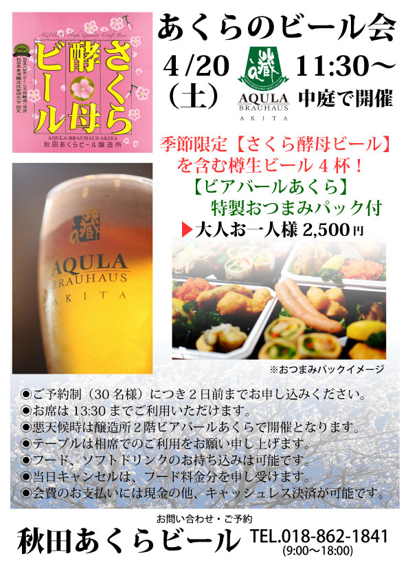 あくらのビール会 2024.4.20(土) 2024.04.06 Tweet Share RSS あくらの中庭で樽生ビールを楽しみませんか?季節限定【さくら酵母ビール】を含む4杯!【ビアバールあくら】特製おつまみパック付お一人様2,500円です。ご予約お待ちしております。 ◉2024年4月20日(土)11:30-13:30◉お席は、13:30までご利用いただけます。◉ご予約制(30名様)につき二日前までお申し込みください。◉悪天候時は醸造所2階ビアバールあくらで開催となります。◉テーブルは相席でのご利用をお願い申し上げます。◉フード、ソフトドリンクのお持ち込みは可能です。◉当日キャンセルは、フード料金分を申し受けます。◉会費のお支払いには現金の他、キャッシュレス決済が可能です。 【お問い合わせ】秋田あくらビール電話 018-862-1841(9:00-18:00) 【提供ビールについて】当日のビールについて、季節限定「さくら酵母ビール」を含む4種類の飲み比べセットを提供いたします。ビールの追加注文につきましては、レギュラーサイズをイベント価格(1杯600円)にて承ります。キャッシュオンでの提供とさせていただきます。 Tweet Share RSS この記事のタイトルとURLをコピーする TOPICS, イベント情報 東日本大震災から11年。東北魂ビールプロジェクト東北6醸造所ビールセット!3月10日より出荷開始! 前の記事